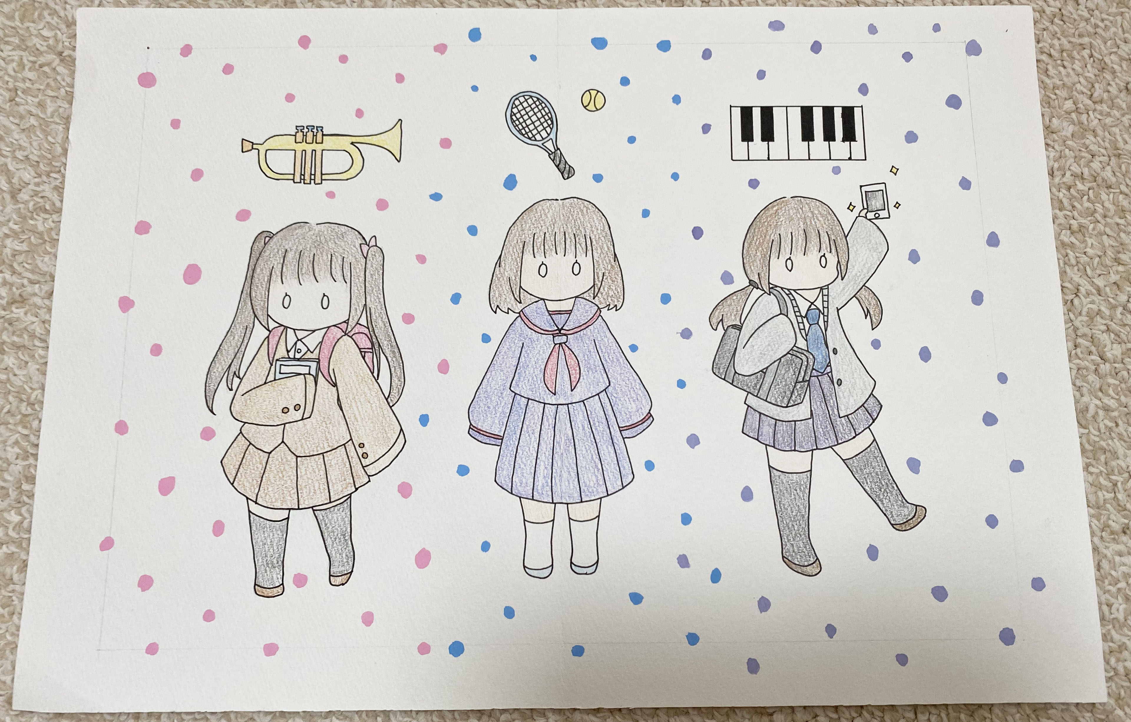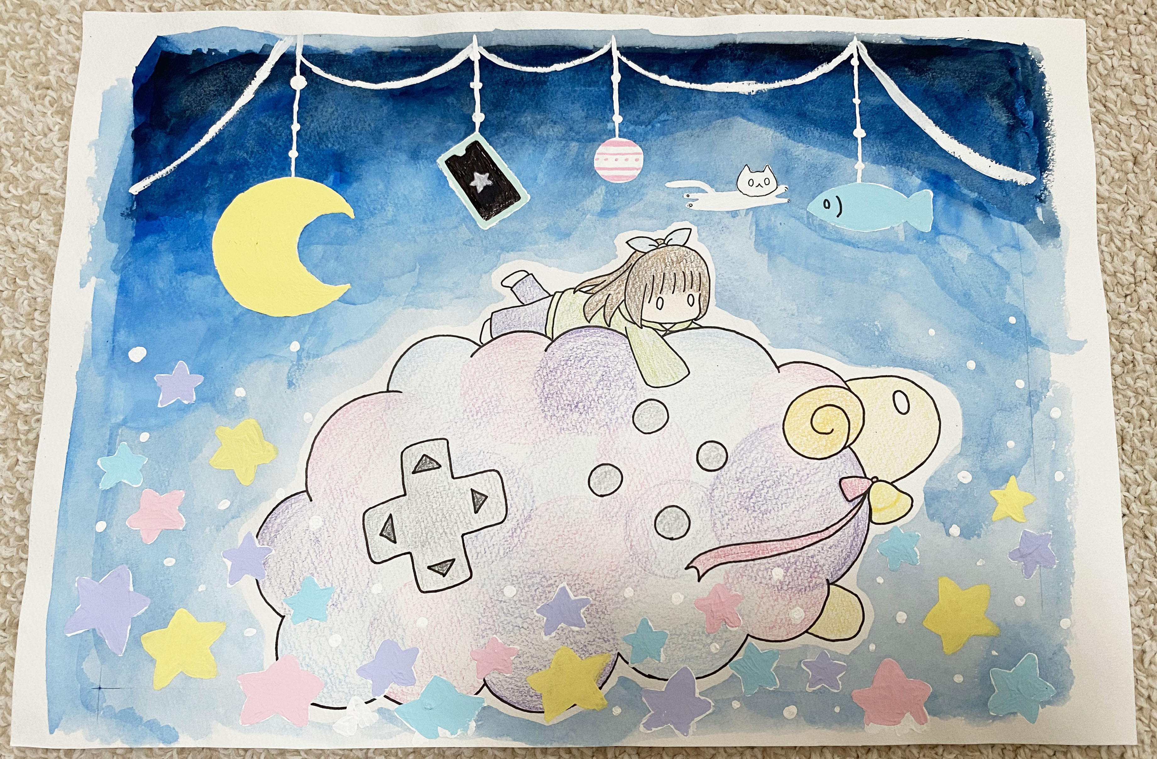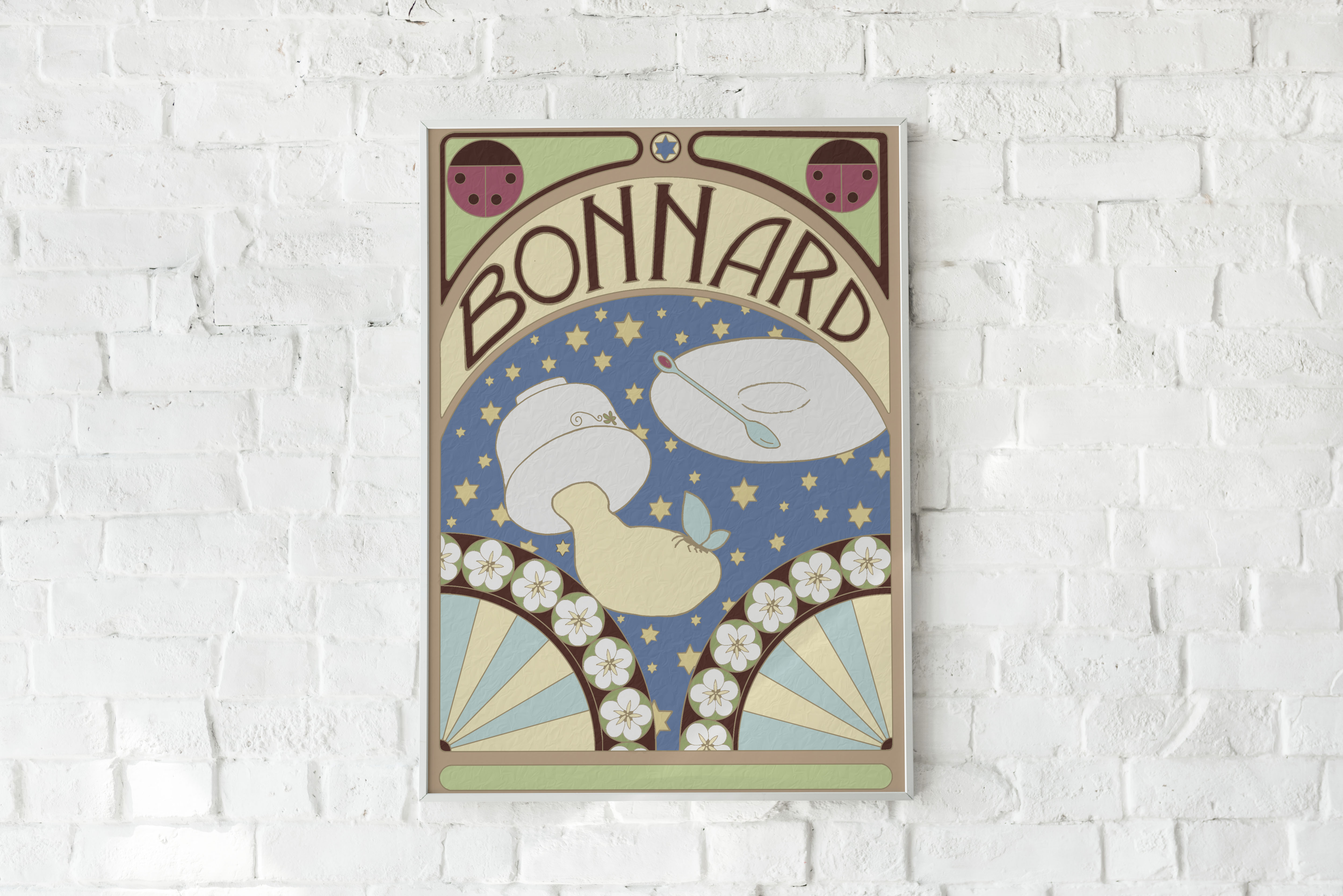画家のアルフォンスミュシャのようなタッチでカフェのポスターを制作する課題でした。色づかいや装飾に拘っています。初めてPhotoshopを使って絵を描いたので苦労しましたが、可愛くて落ち着くイメージに仕上がったので、私のお気に入りの作品です。